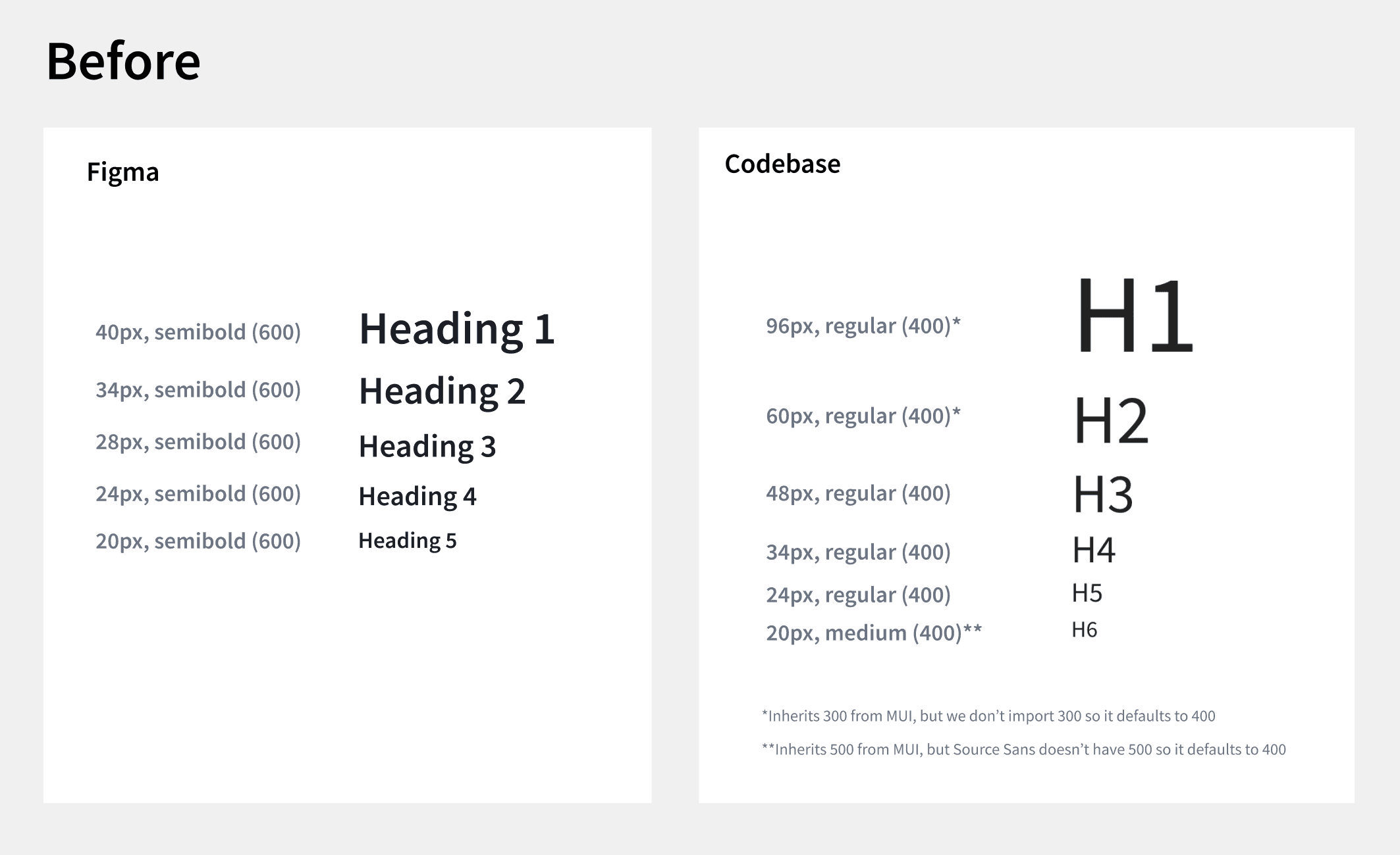 Heading sizes and weights in Figma were completely different from what was in the codebase. For example, Figma's H1 was 40px semibold, while the code rendered H1 at 96px regular. H3 in Figma was 28px, a font-size that the codebase didn't even have. Figma had 5 headings, the code had 6.